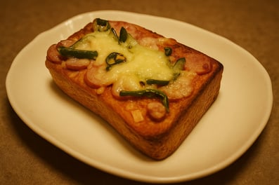 こんがり焼いたパンの上に、ジューシーなソーセージと旨みあふれるサラミ。 とろけるチーズと合わさって、お酒のお供にぴったりな一皿です。
